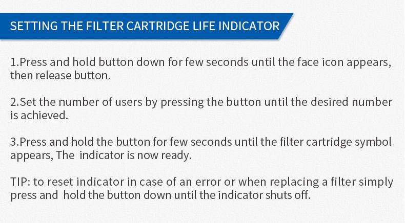 ■ 使用人數標誌—螢幕上出現4個閃動笑臉後,快速按START鍵出現幾個笑臉,表示可供幾人使用,再長按3秒至濾芯標誌出現,表示設置成功。